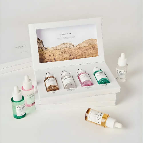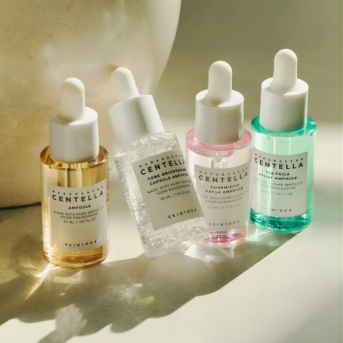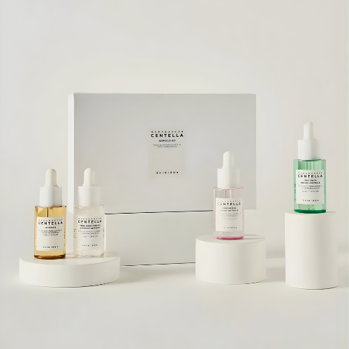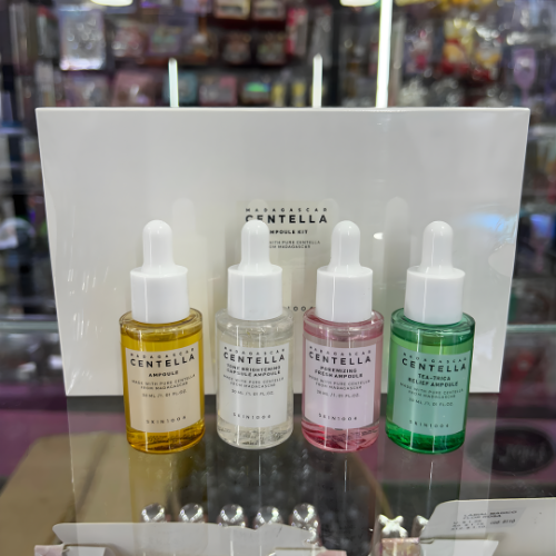 El Kit de Ampollas Madagascar Centella de SKIN1004 es un set completo de 4 sérums diseñados para tratar diferentes necesidades de la piel, combinando el poder calmante de la Centella Asiática de Madagascar con activos específicos para iluminar, minimizar poros y controlar imperfecciones.