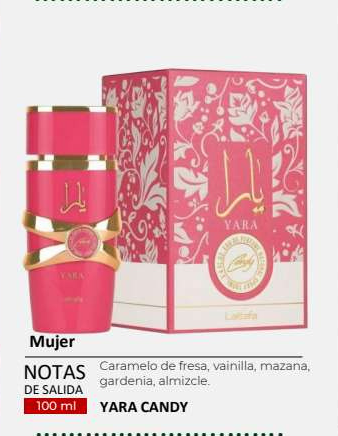 El perfume Yara Candy es una fragancia floral frutal gourmand lanzada en 2024, ideal para mujeres que buscan un aroma juvenil y divertido. Su apertura es fresca y dulce, con notas de grosellas negras y mandarina verde, seguida de un corazón efervescente con Strawberry Fizz Candy y gardenia. La base es cremosa y envolvente, con vainilla, ámbar, sándalo y almizcle, que proporciona una estela duradera y seductora.